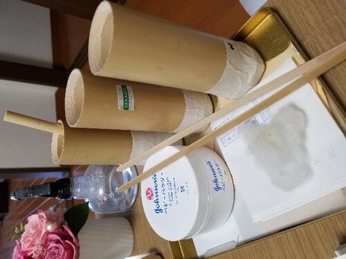 今日も生きてます。 金箔はなかなか扱いが難しいです。 思っていたようになかなかうまくいかず…これは自分なりに工夫するしかないなー。 ↓は金箔で使う道具たち。 この展覧会のために揃えました。 箸みたいなものは金箔をはさめて持つためのもの。 筒は下に…